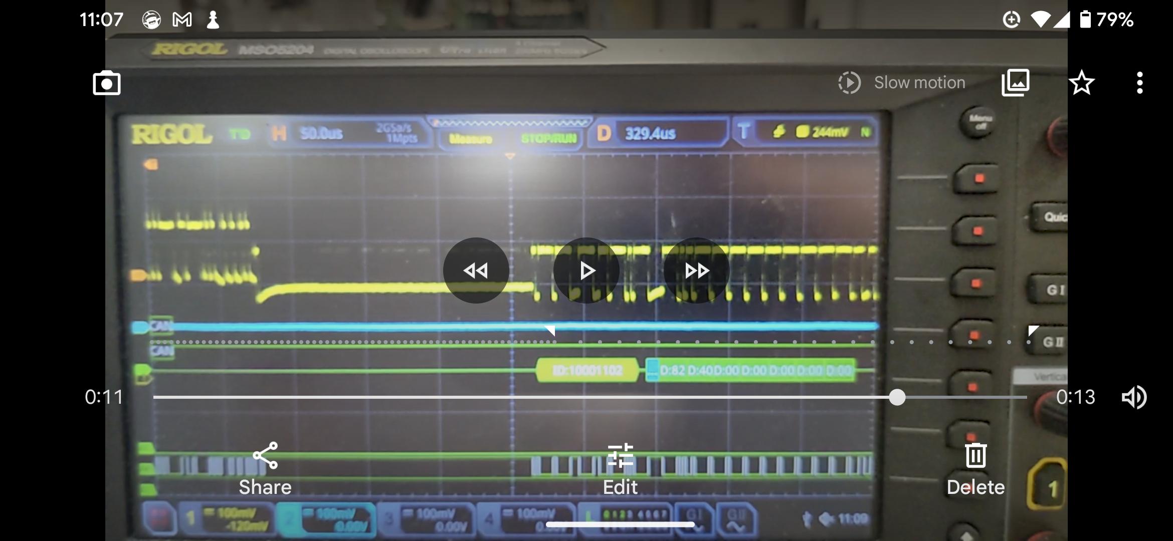 编辑:确认的MCU响应问题-看起来像在单片机上的固件。我的Rigol不会触发在ID上,所以我不得不1/8的视频,然后屏幕截图,以捕捉它在行动。您可以看到响应都是7字节的空值。
