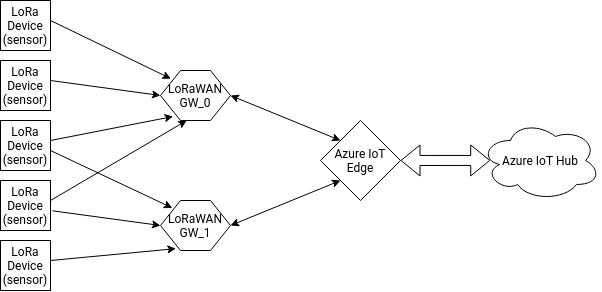 这对您可能有用:https://github.com/Azure/iotedge-lorawan-starterkit。这是一个使用IoT边缘和Lorawan的演示程序,尽管它可能使用特定的硬件。不过,你也许能使它适应你的需要。