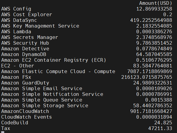 os.system('''aws ce get-cost-and-usage --profile dev --time-period Start=$(date "+%Y-%m-01"),End=$(date --date="$(date +'%Y-%m-01') + 1 month - 1 second" -I) --granularity MONTHLY --metrics USAGE_QUANTITY BLENDED_COST --group-by Type=DIMENSION,Key=SERVICE | jq -r '[ .ResultsByTime[].Groups[] | select(.Metrics.BlendedCost.Amount > "0") | { (.Keys[0]): .Metrics.BlendedCost } ] | sort_by(.Amount)| add' > /tmp/cost.json''')
