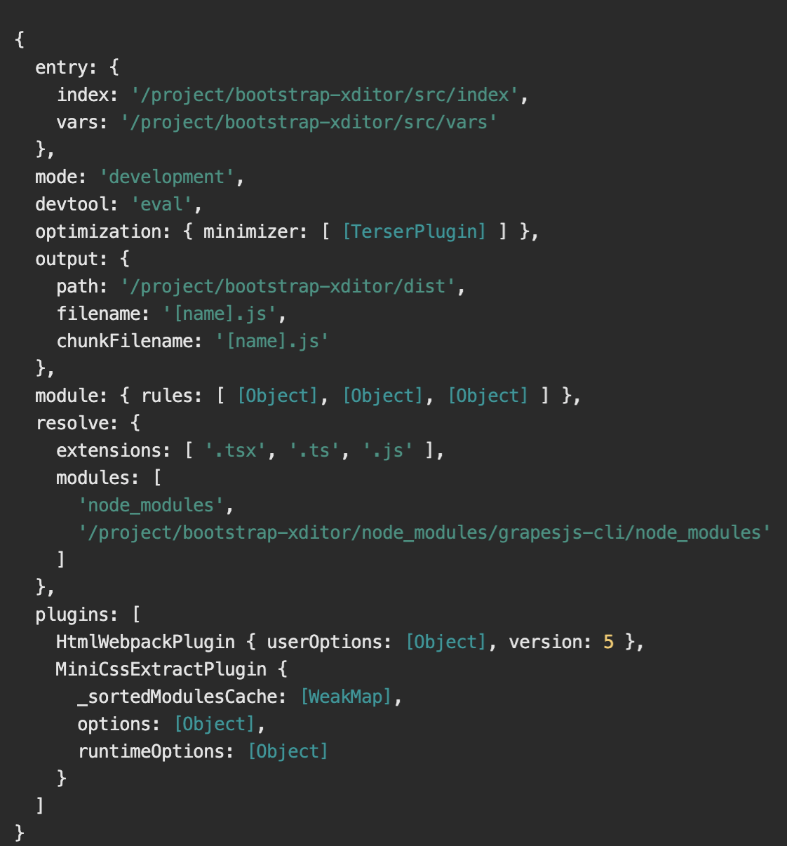 葡萄Cli包含webpack的默认配置,如果帮助,这就是我修改配置时得到的。