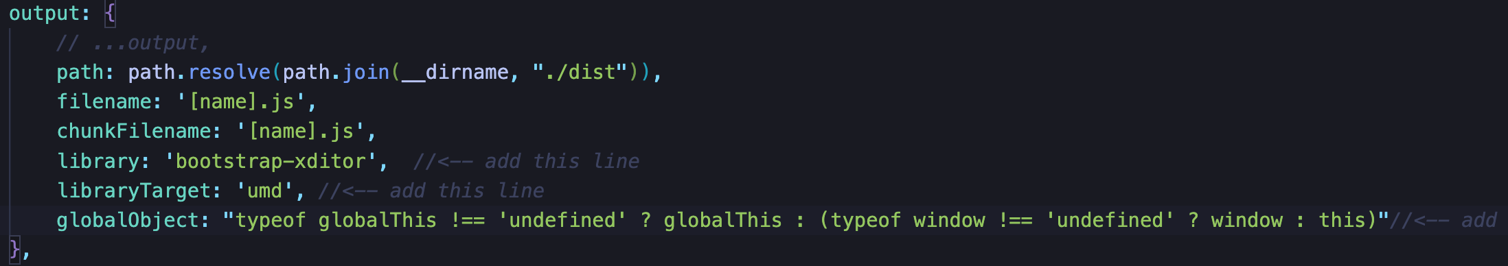 globalObject: "typeof globalThis !== 'undefined' ? globalThis : (typeof window !== 'undefined' ? window : this)"//<-- add this line