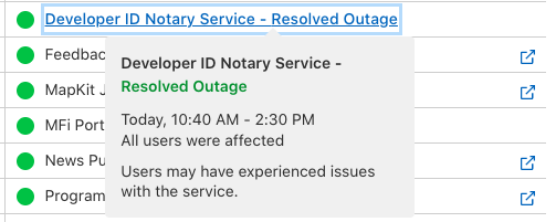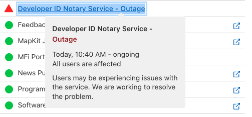 然而,它现在声明在苹果开发者端有一个Developer ID Notary Service - Outage。