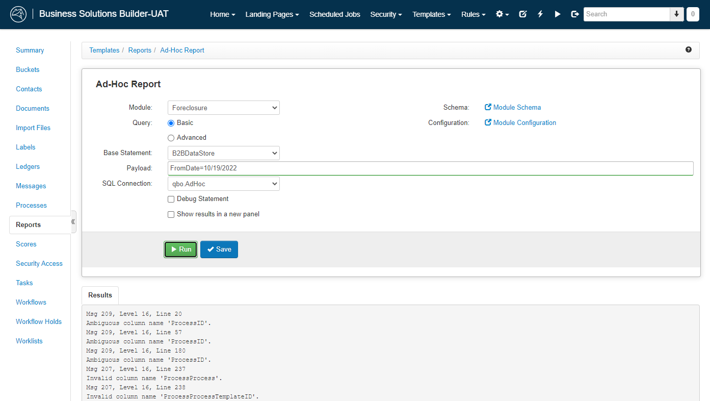 Module是ForeclosureQuery是BasicBase Statement是B2BDataStorePayload包含要传递给该语句的任何参数的查询字符串。在Results面板中,我们可以看到server报告的错误,包括: