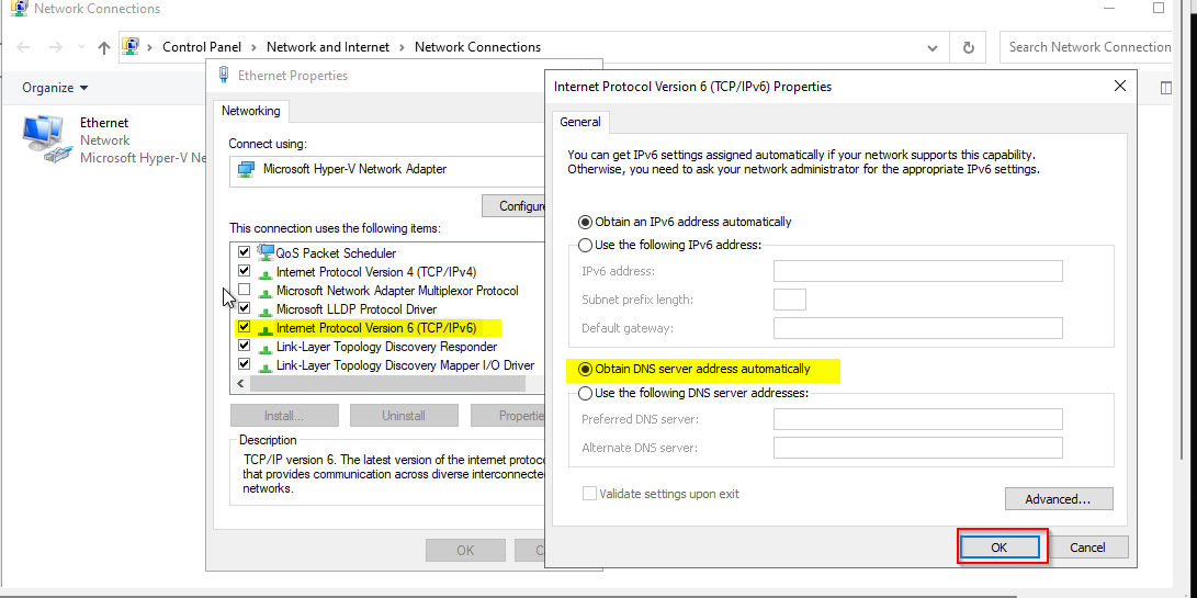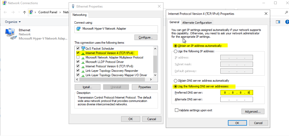 如果这仍然是在您的搜索框中持久化,则->网络和internet ->以太网->右击->properties -> internet协议版本提供DNS服务器如下所示。