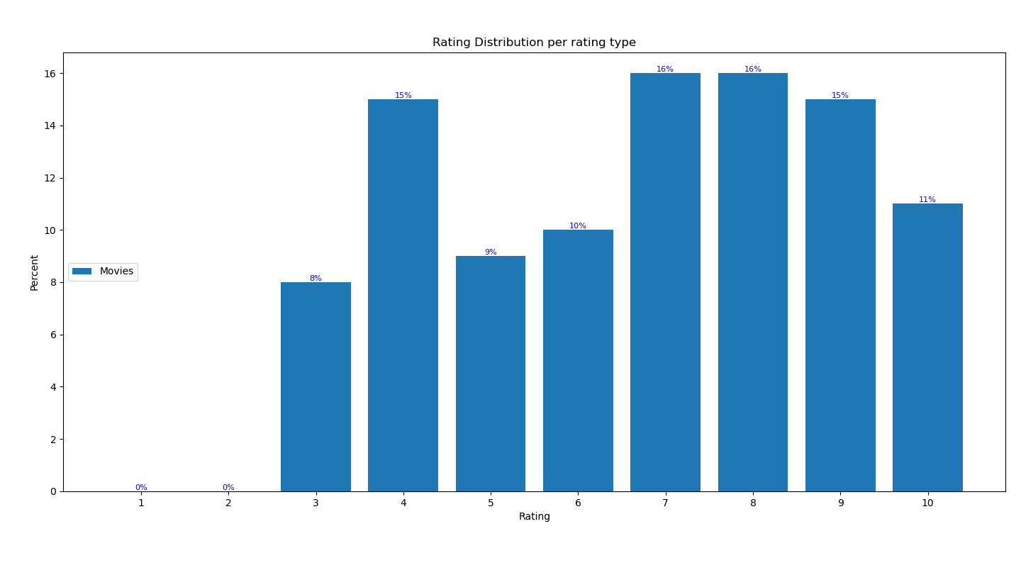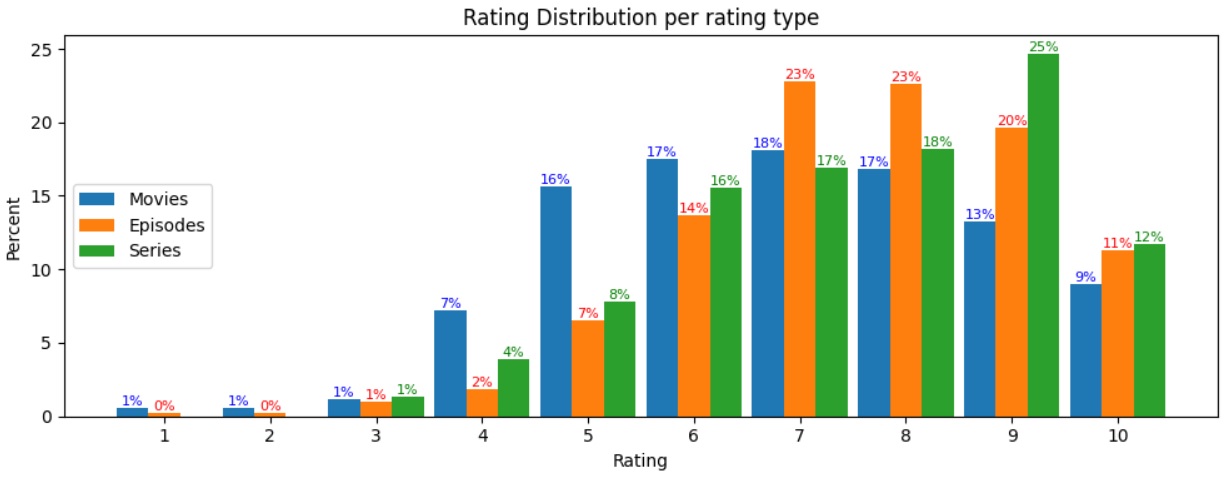 我一直在使用我自己的IMDB数据来练习熊猫和绘图,并创建了一个条形图,用来显示3种收视率之间的等级分布:电视剧、电影和电视剧。