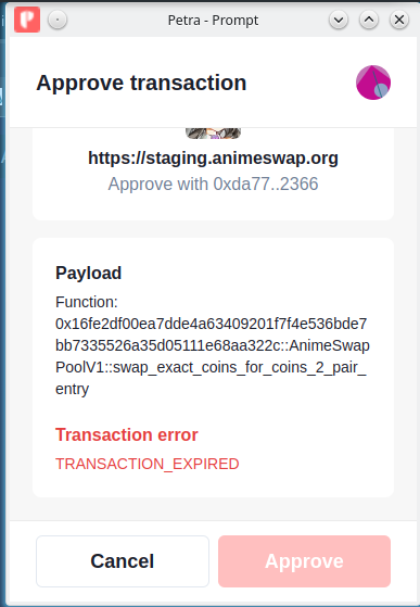 您正在使用的dapp错误地设置了事务的过期时间,以至于它在等待您批准时过期。我会联系动画界,让他们知道:-)