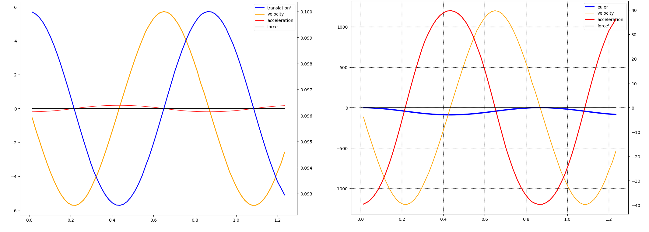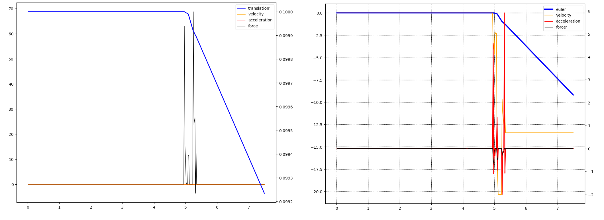 图表示法:(这里和下面)左图包含沿世界Z轴的线性量(m、m/s等),右图包含围绕世界Z轴的角量(以度、deg、deg/s等为单位)。带有后置撇号的图例条目使用二级Y轴刻度;其他图例条目使用主Y轴刻度。