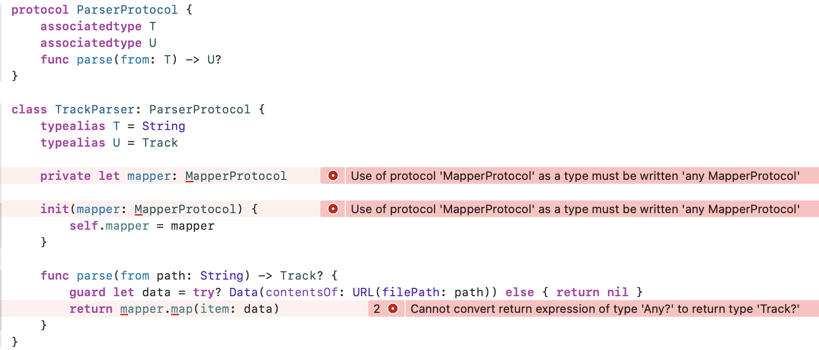 注意,parse实现要求映射程序具有T == Data和U == Track,但是您还没有在TrackParser中的任何地方指定这些约束。
