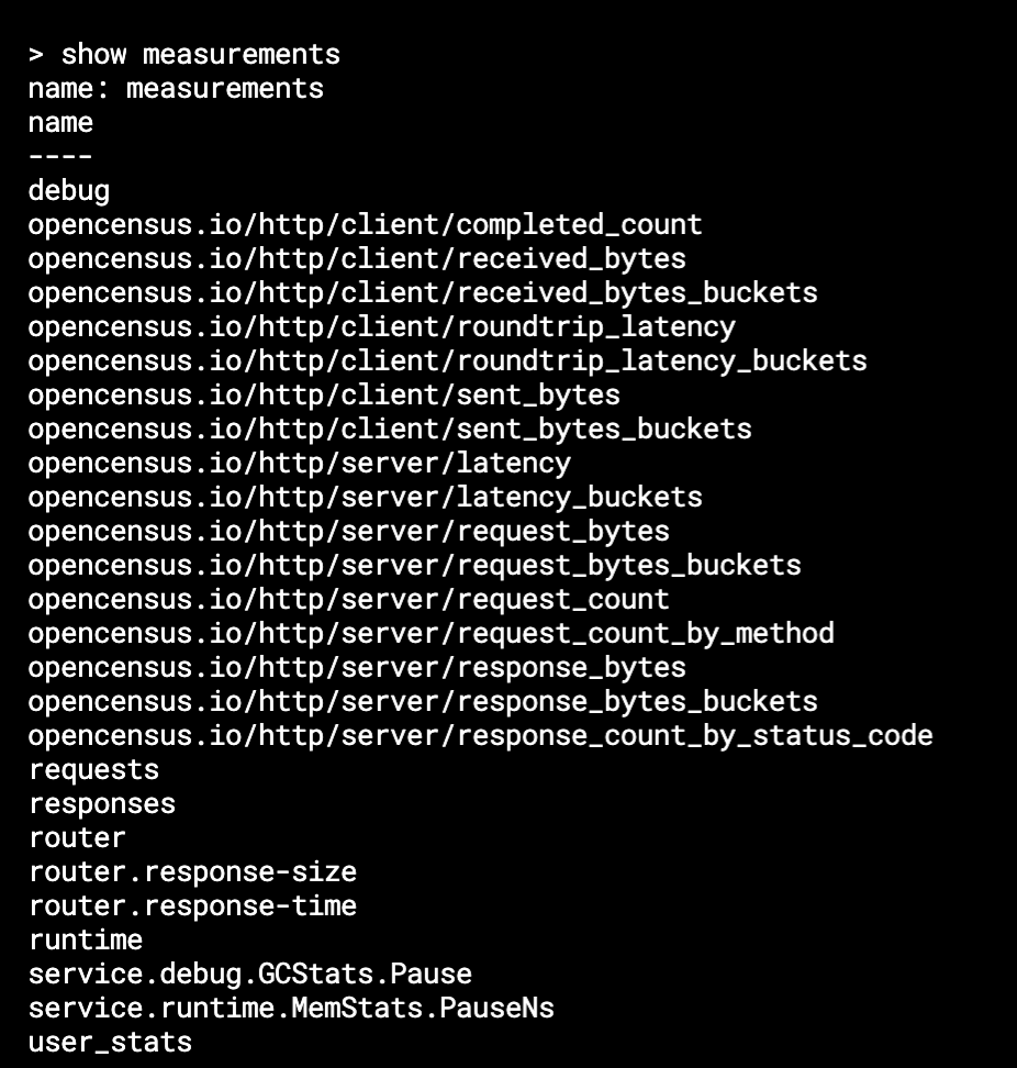 }我想可能是我的数据没有在influxDB中结束,所以我进去检查了它有什么。show measurements给出了下面的输出,所有的度量都有一些数据。