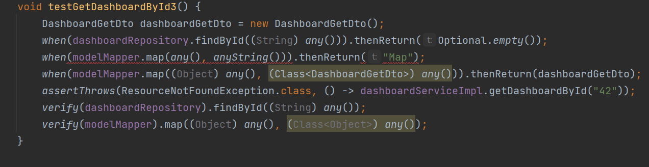 when(modelMapper.map((Object) any(), (Class<DashboardGetDto>) any())).thenReturn(dashboardGetDto);现在我不明白的是,在上面的行中,到底在哪里发生了转换,为了使测试用例正常工作,必须更改什么?
