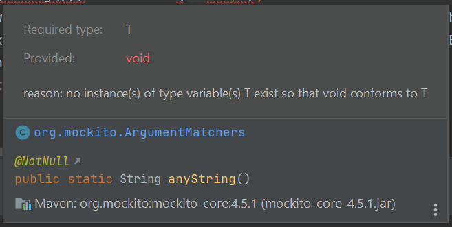 请注意,ArgumentMatchers#any()已经是通用的,因此不必强制转换返回值。您可以使用ArgumentMatchers.<Object>any()或any(Object.class)。