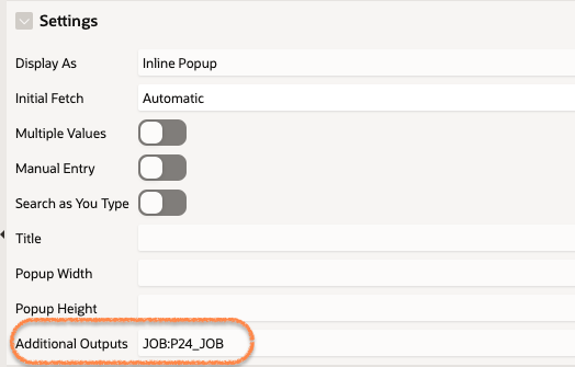 此示例有一个带有弹出lov的页面项,该lov是从示例EMP表中选择的,该表具有显示值: ename、返回值: empno、附加列作业。当我选择一个值时,页面项P24_JOB会被设置为所选记录的作业值。