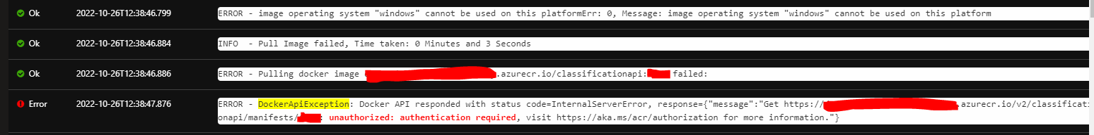 projectcontainerregistry.azurecr.io/classificationapi:123 2022-10-26T11:11:36.260Z错误图像操作系统"windows“不能在此platformErr: 0上使用,消息:图像操作系统"windows”不能在此平台上使用2022-10-26T11:11:36.634Z信息-拉图失败,所用时间:0分钟0秒2022-10-26T11:11:36.634Z错误-拖坞图像platformErr失败: 2022-10-26T11:11:37.604Z错误- DockerApiException: responded响应状态code=InternalServerError,Response={“消息”:“获取https://projectcontainerregistry.azurecr.io/v2/classificationapi/manifests/123:未经授权:身份验证是必需的,请访问https://aka.ms/acr/authorization以获得更多信息”}