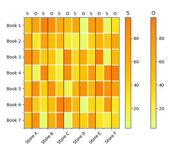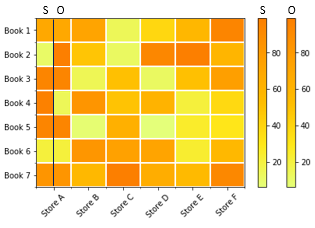 在我手头的问题中,我想将两个热图合并到一个图表中。下面的示例创建一个热图,它捕获x轴上的存储单元和y轴上的书籍的销售数量。现在,我们可以合理地假设这些单位是通过两种不同的分销渠道销售的:商店(S)和在线(O)。