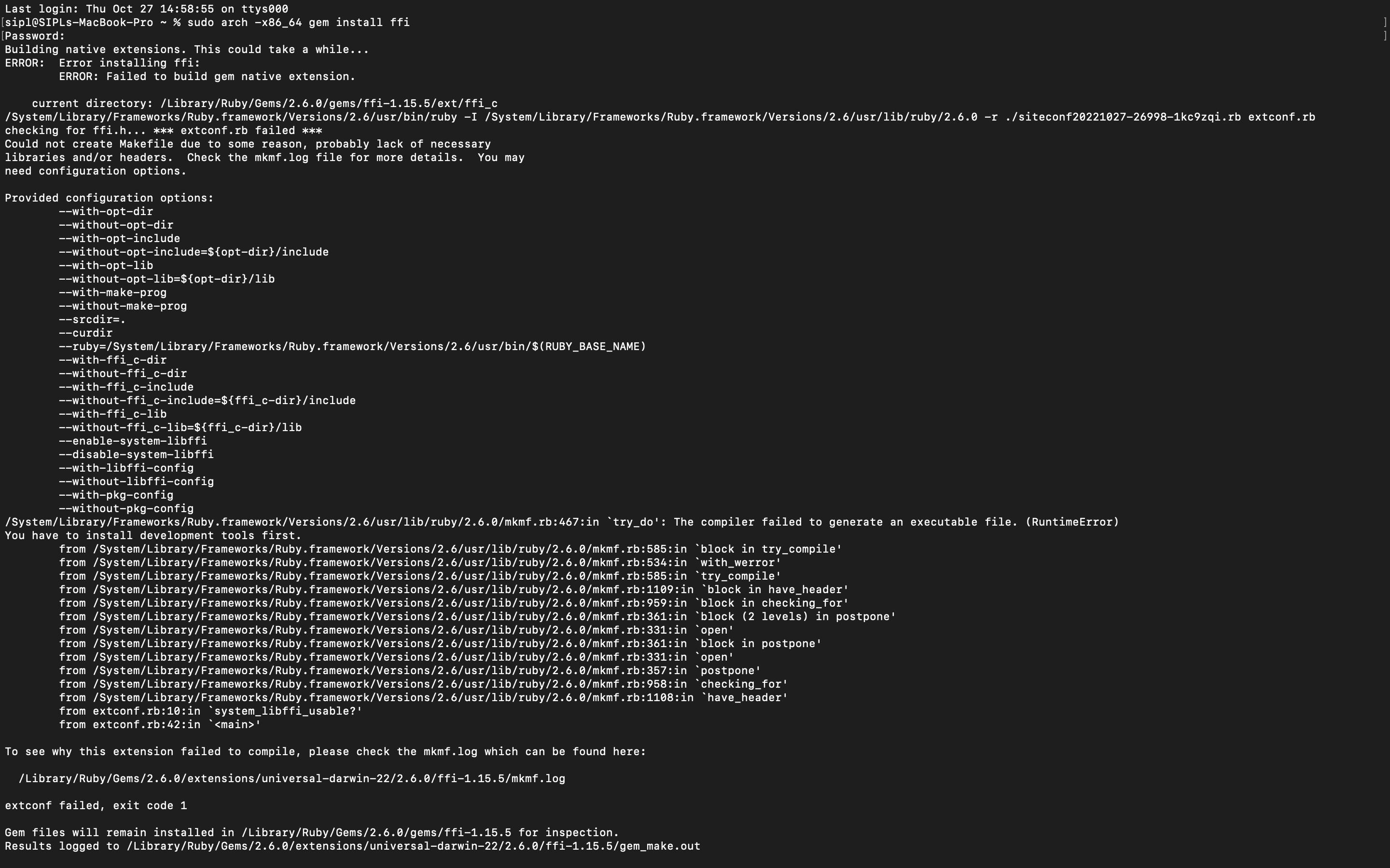 当我运行这个命令时,我会得到这个错误。数独拱-x86_64创业板安装ffi。