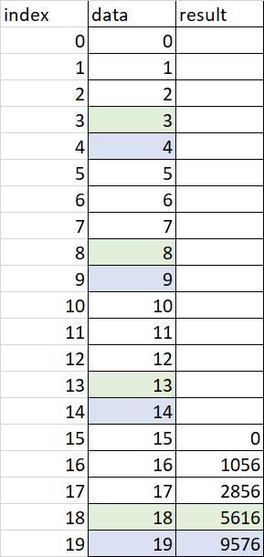 我想计算不相邻行的滚动乘积,如照片中所示的每五行值的乘积(结果是蓝色单元格中数据的乘积等等)。