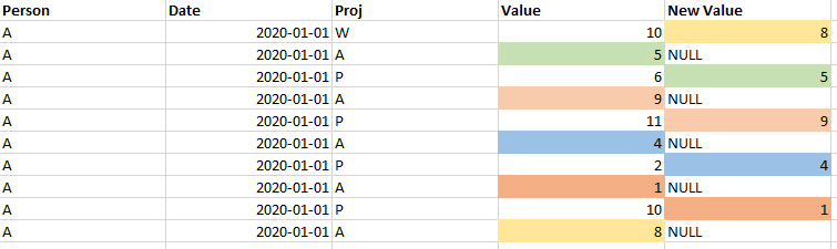 例如,行-10具有proj值A,行-1具有proj值W,因此与第-1行对应的new_value列应该为8。