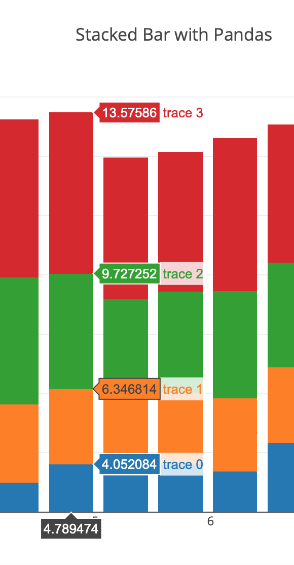 barmode="stack"绘制堆叠条形图。将plotly.express导入为px df.reset_index(inplace=True) df = df.iloc:,:-1.熔体(id_vars=‘index’,var_name=‘类别’,value_name='count')图= px.histogram(df,x=“索引”,y=“计数”,text_auto=True,color=“类别”,barmode=“堆栈”,labels={‘A’:‘香蕉’},height=400) fig.show()