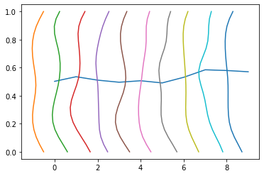 ax.plot(-kde(y)+i, y)