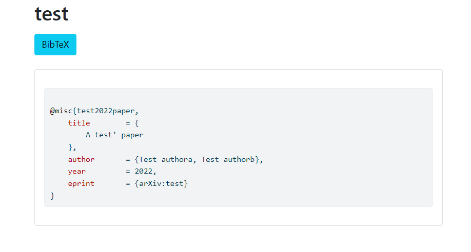 title = { A test' paper},author = {Test authora, Test authorb},year = 2022,eprint = {arXiv:test}}“