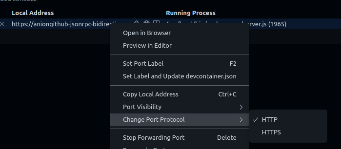 at 'https://aniongithub-jsonrpc-bidirectional-example-<redacted>-8080.preview.app.github.dev/client.js:9:10'文档这里声明By default, GitHub Codespaces forwards ports using HTTP but you can update any port to use HTTPS, as needed。当我检查所指示的设置时: