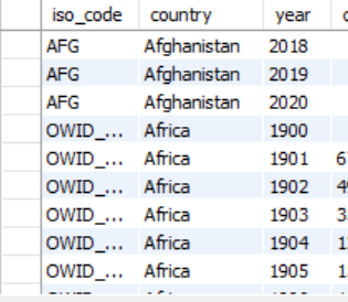 select distinct left(country,3) as country from owid_energy_data选择iso_code (第一栏)只有三个字母的国家: