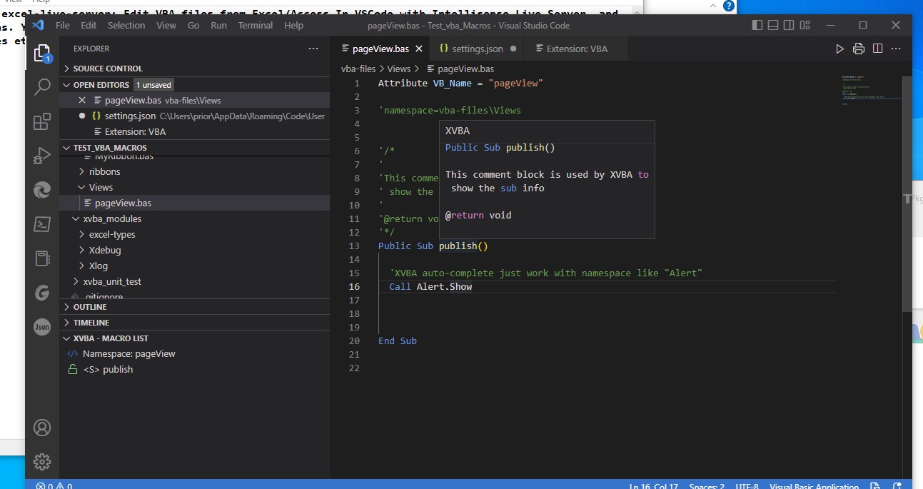 我厌倦了使用默认的VBA编辑器来创建/修改MS宏。因此,决定尝试使用vsCode编辑器。在应用程序市场中,有一个名为的包。这个软件包有最多的下载量和明星数量非常有限的VBA软件包,可在市场上使用。