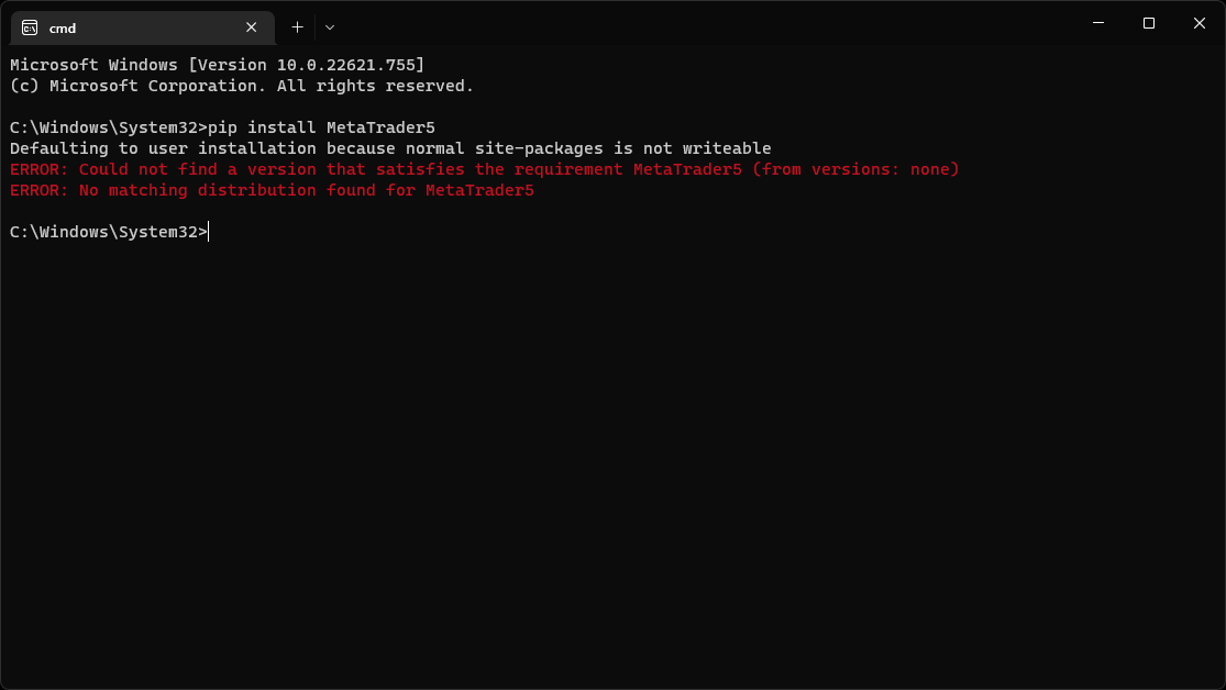 我想尝试使用python进行MetaTrader5编程,在python文件中我有import MetaTrader5。但是不可能下载这些软件包。我试图在windows上运行这个命令。