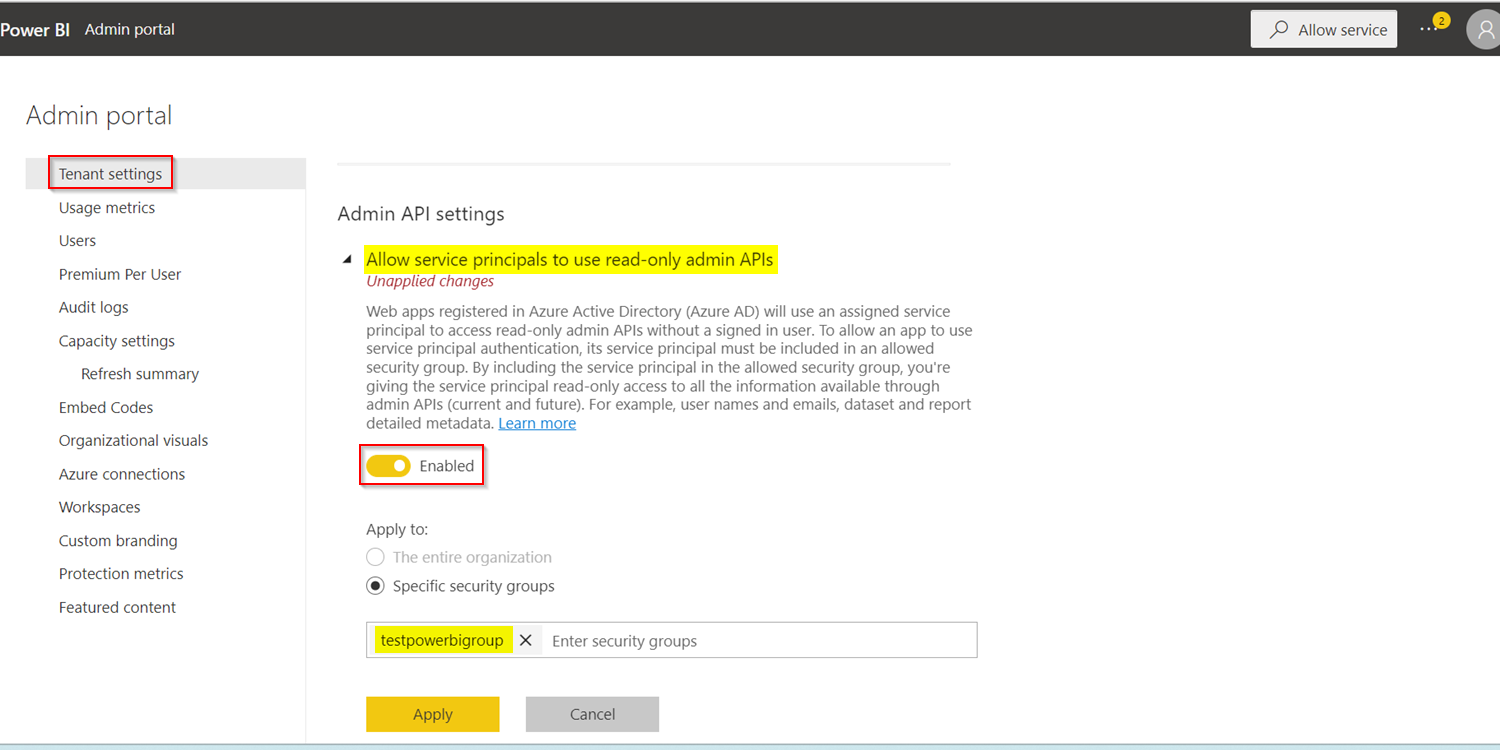 在Allow service principals to use read-only admin APIs PowerBi Admin Portal中,启用PowerBi添加上面创建的安全组: