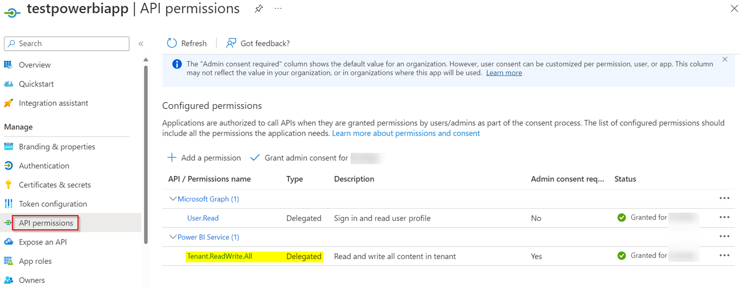 我创建了一个Azure AD应用程序并授予了权限: