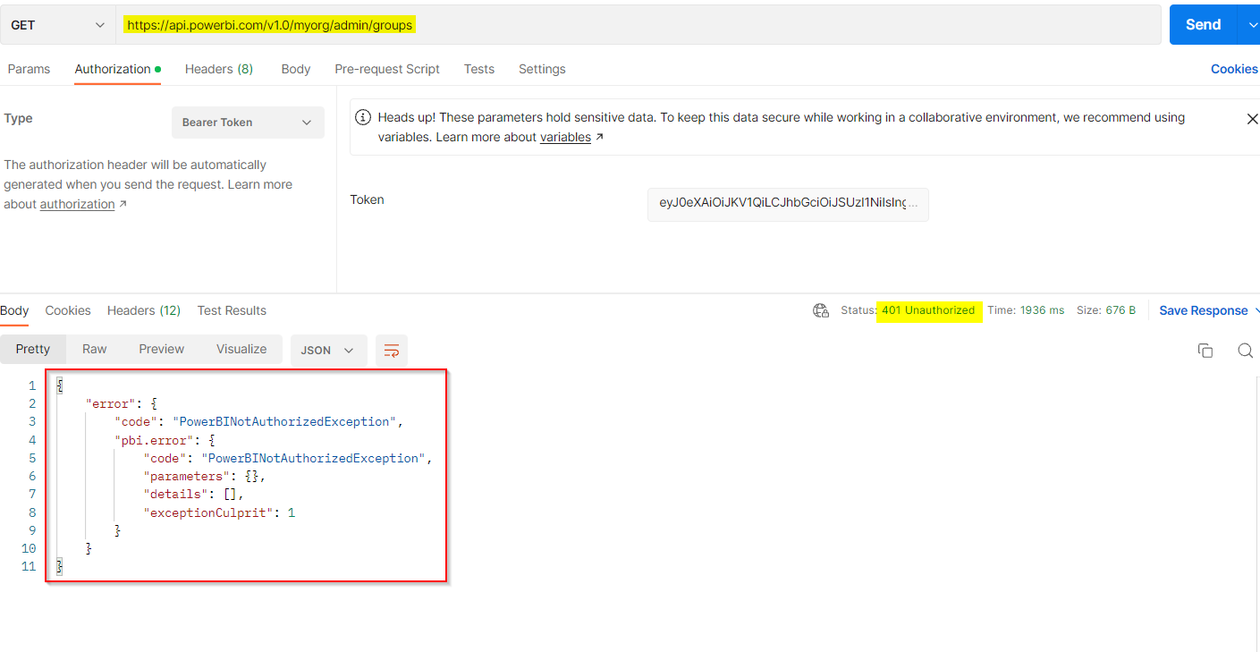 {'token_type': 'Bearer', 'expires_in': '3599', 'ext_expires_in': '3599', 'expires_on': '1667296164', 'not_before': '1667292264', 'resource': 'https://analysis.windows.net/powerbi/api', 'access_token': 'longlongalphanumericstring'}它似乎找到了正确的访问令牌。但是,当我打印数据时,我得到一个<401>错误,json_data读取