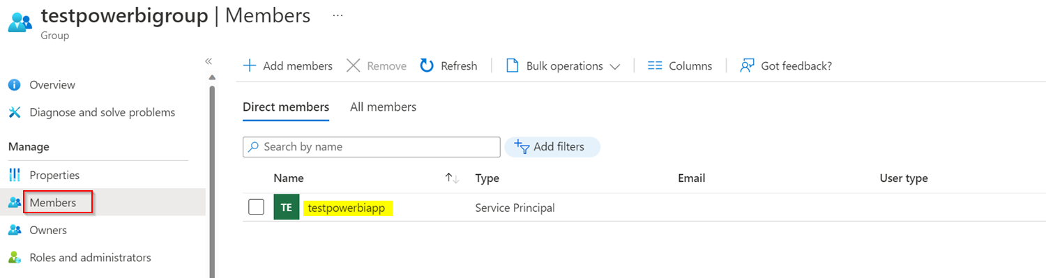 我创建了Azure安全组,并将服务主体添加为成员,如下所示:
