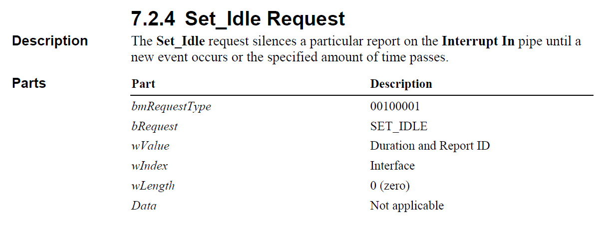 我试图复制使用HID接口控制设备的软件的行为,工作流程是发送空闲请求,然后向设备发送大量数据,我可以发送数据,但我不知道如何发送空闲请求。我在网上找到了HID文件然后看到了这个