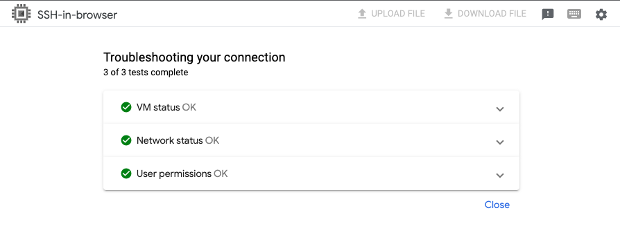 在SSH连接失败后,您可以从GCP文档中选择重新尝试连接,或者使用SSH浏览器中的故障排除工具对连接进行故障排除。我确实做了故障排除,但所有步骤都是绿色的。