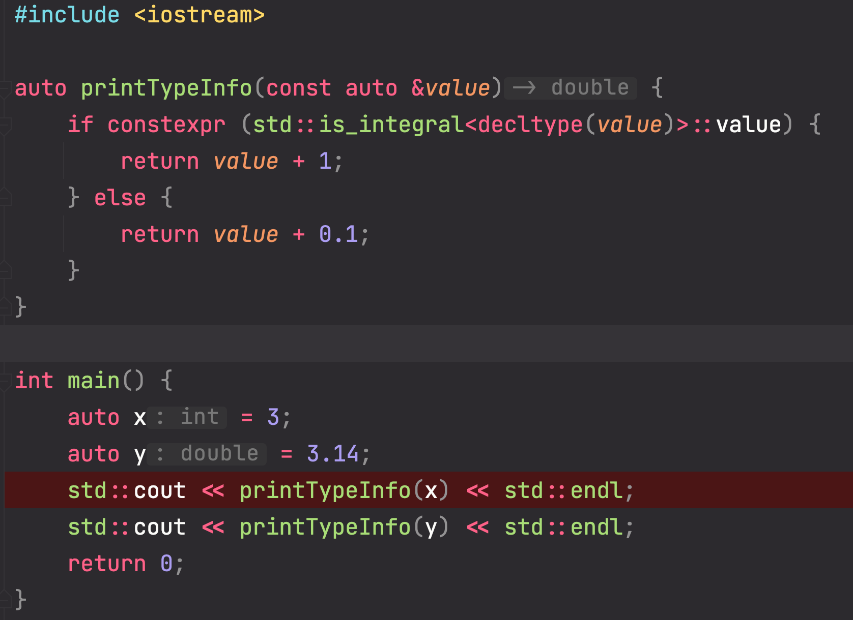 我想探讨一下if-的特性,并尝试在编译时找出类型信息。为此,我编写了以下代码。我预计printTypeInfo函数将返回4表示x,3.24返回y,但是,它给出了3.1和3.24。我不知道哪里出了问题。