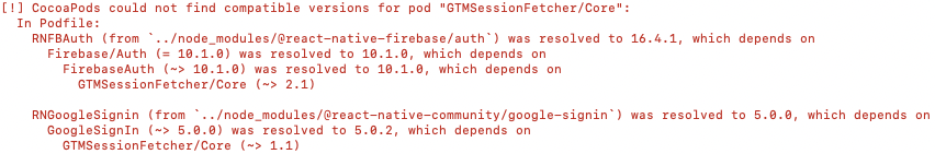 我正在做一个反应-本机移动应用程序,并希望合并Firebase和Firebase身份验证。但是,当我运行'pod安装‘或'pod更新’时,我将面临这个错误: