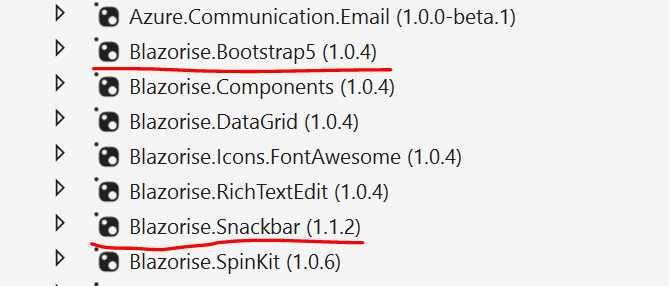 在我的blazorise项目中,我一直在使用blazorise控件。我三个月前就开始做这个项目了。现在我想使用Blazorise.Snackbar组件。所以我运行nuget package命令来安装组件。现在我的项目不运行了。它显示了Program.cs文件中以下代码行中的异常