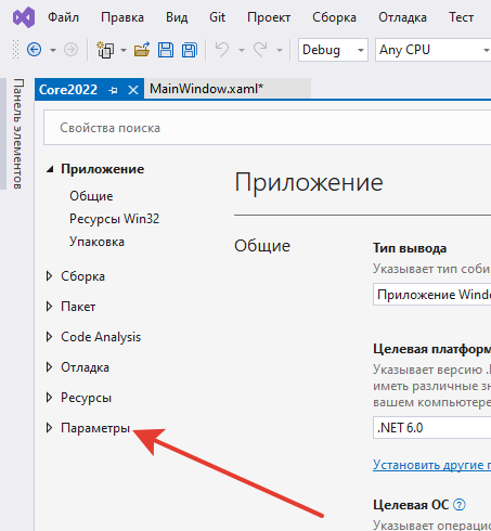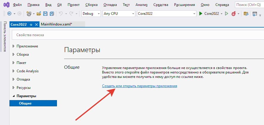 我的配置是Win10+VS2022。我正在创建一个WPF .Net6项目。我转到“Properties”菜单。在“项目属性”选项卡的菜单(左边的列)中有一个项选项。选中时,如果尚未创建设置,则将有一个小注释和一个指向“打开或创建应用程序设置”的链接。