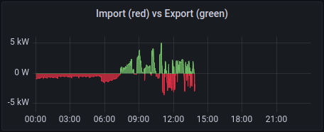 我有一个InfluxDB数据库,可以测量网格电源的使用情况。当我们的太阳能光伏不足以为房子供电,而且我们从电网进口时,电网的电力是负值的。同样,当我们有多余的太阳能光伏发电,并且我们输出到电网时,测量值是正的。