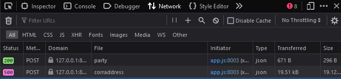您将收到500个错误,因为列party_id不能为空,因此插入数据库失败。在创建新的紧身连衣裙时,您总是必须发送它,或者您可以将其设置为可空。