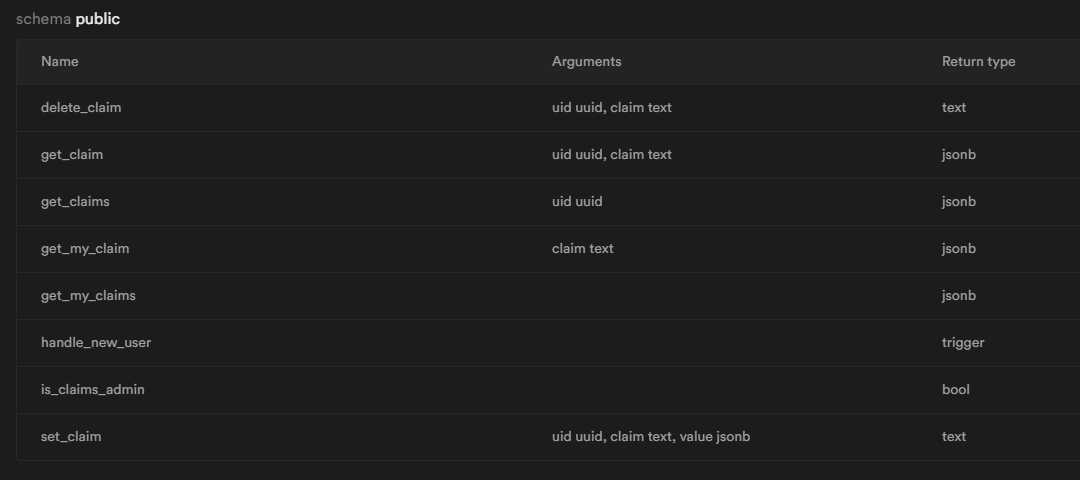 我正在寻找一种在supabase中实现RBAC的方法,当我尝试在一个运行在新用户的这.However上的触发函数中运行set_claim时,我偶然发现了这个函数不存在的错误。