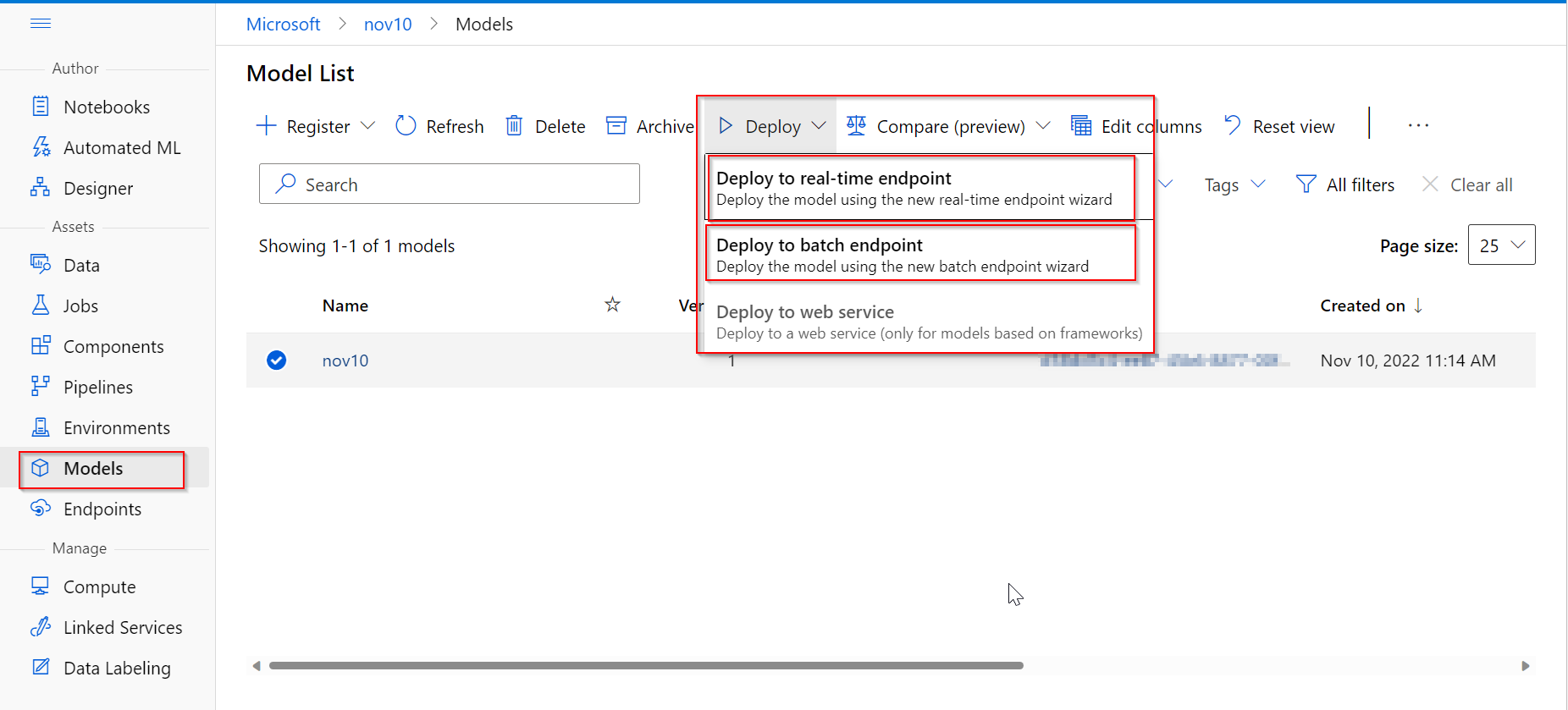 我们可以使用批处理或实时端点进行部署。在单个管道中创建具有多个模型的示例应用程序。我们需要将单个模型结果进行注册,然后单击模型部分中的deploy,以便从管道的角度进行部署。