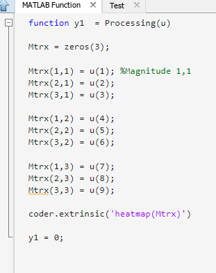 输入这个Simulink模块的数据是连续时间仿真中的单个信号.Simulink块应该形成“矩阵(图像)”并显示出来。我在Simulink中使用Matlab函数块,在此调用heatmap函数,如下所示