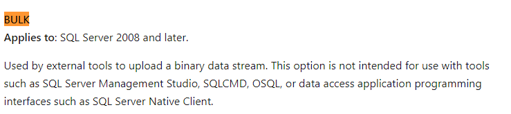BULK INSERT只用于从文件中导入数据,并且可以从SSMS中使用。它也是不同驱动程序可能支持或不支持/使用的API,我发现它作为批量复制API用于批量插入操作。