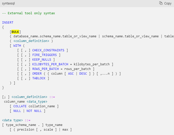 insert bulk <TableName>(Column1 datatype, Column2 datatype, ......., column datatype)