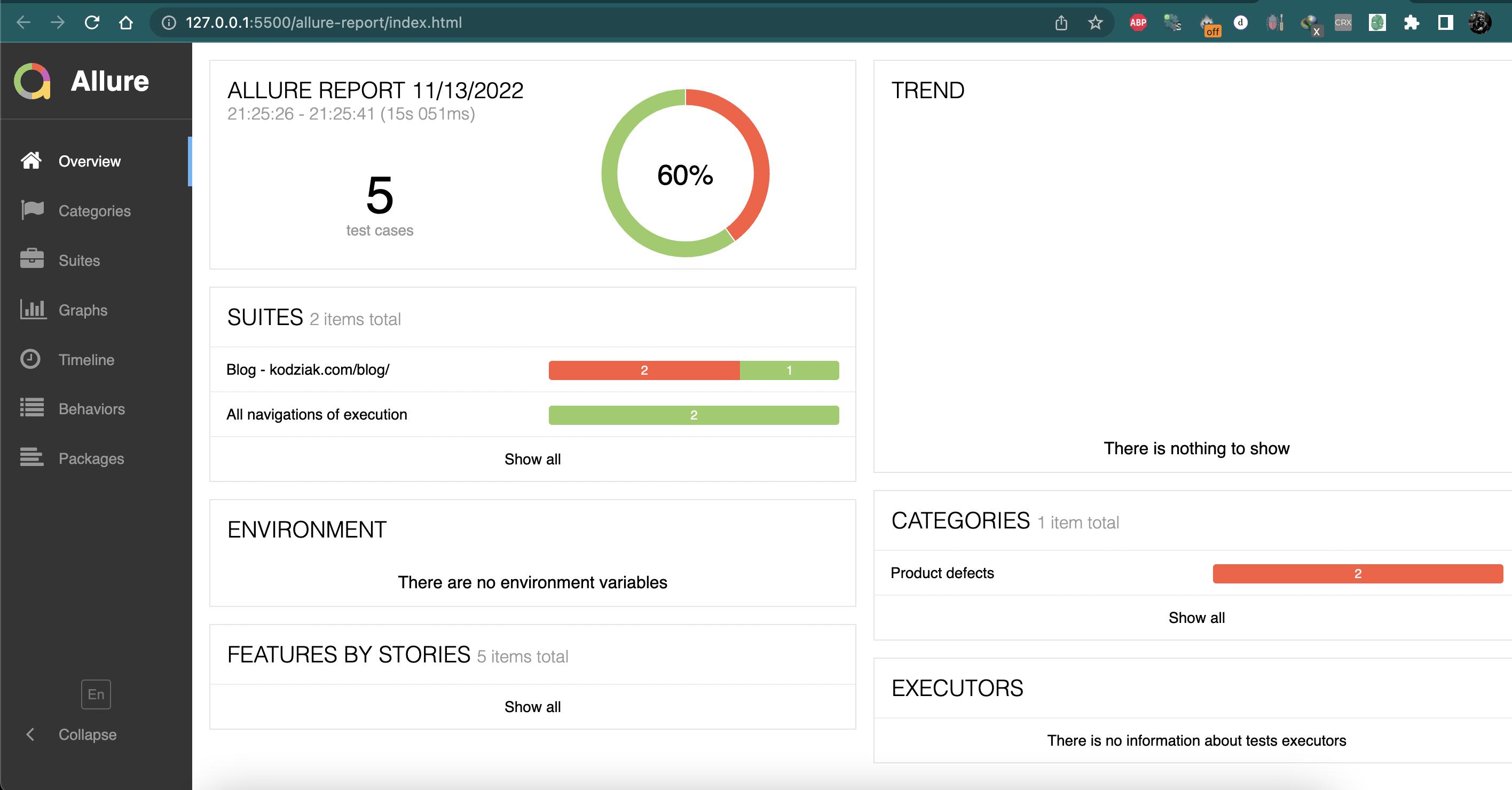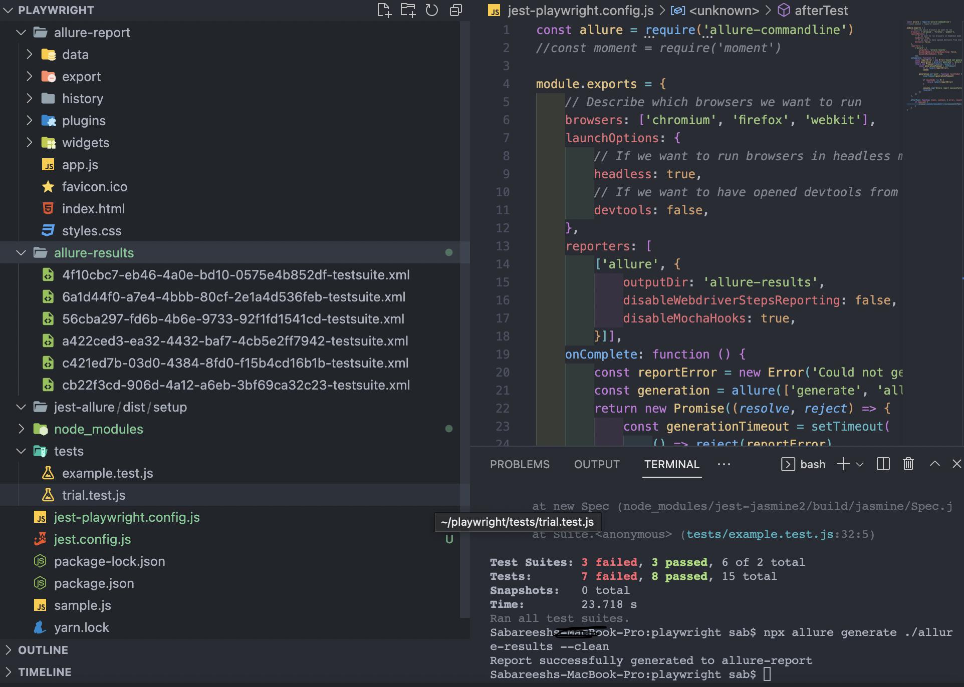 下面是诱人的结果和诱惑报告,后者一旦运行成功就会生成,并命令- npx allure generate ./allure-results --clean。