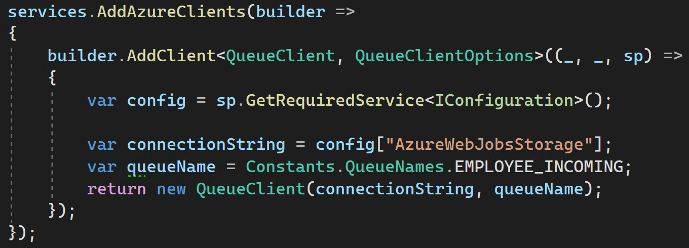 有了所有这些之后,我现在可以实现我的最初目标,并为可能需要利用QueueClient上的任何新特性做好准备,而在编写本报告时,绑定根本不提供这些特性。