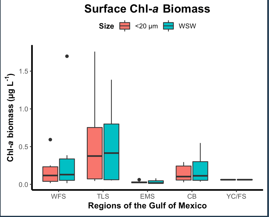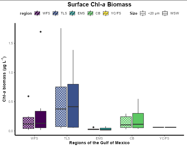 我有关于叶绿素的数据--一种来自两大类浮游植物的生物量:“WSW”和“<20m”级。数据还按墨西哥湾各地区分列(共计5个)。每个区域都具有WSW和<20m值。我试图得到一个方格图来显示每个地区的生物量数据。每个区域都需要一定的颜色,但这不允许区分大小类,所以我选择向其中一个size类添加一个模式。到目前为止,我的代码如下: