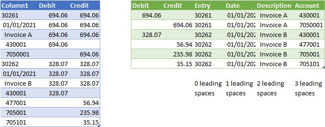如果数据位于一列中,那么对于PowerQuery,您所需要知道的就是如何计算前导空格。