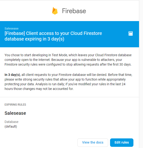 我是Firebase数据库的初学者。当我收到Firebase团队的一封电子邮件时,我正在开发自己的项目,其中说您必须为客户端访问编写安全规则。我不知道如何为火力基地编写安全规则。